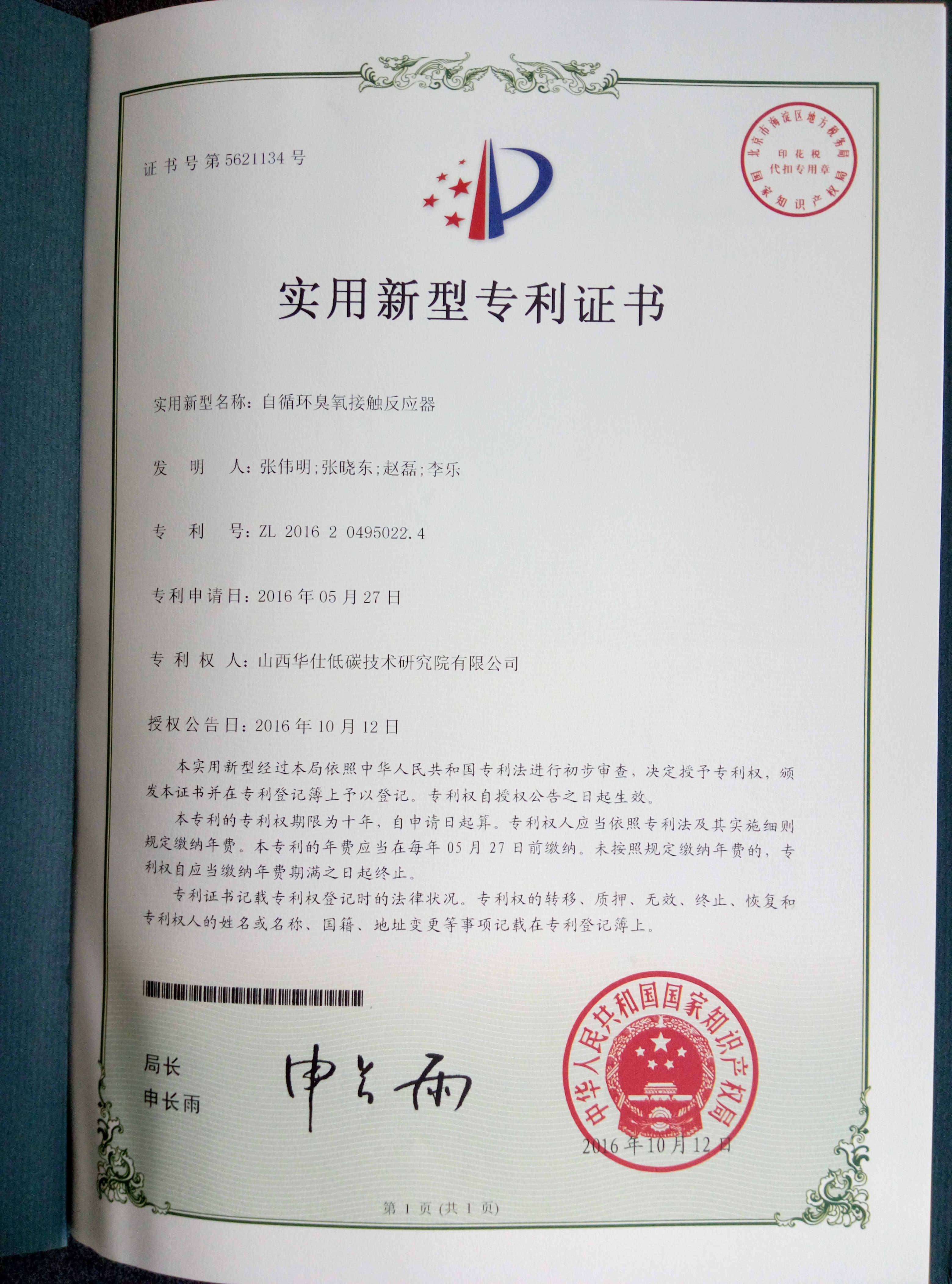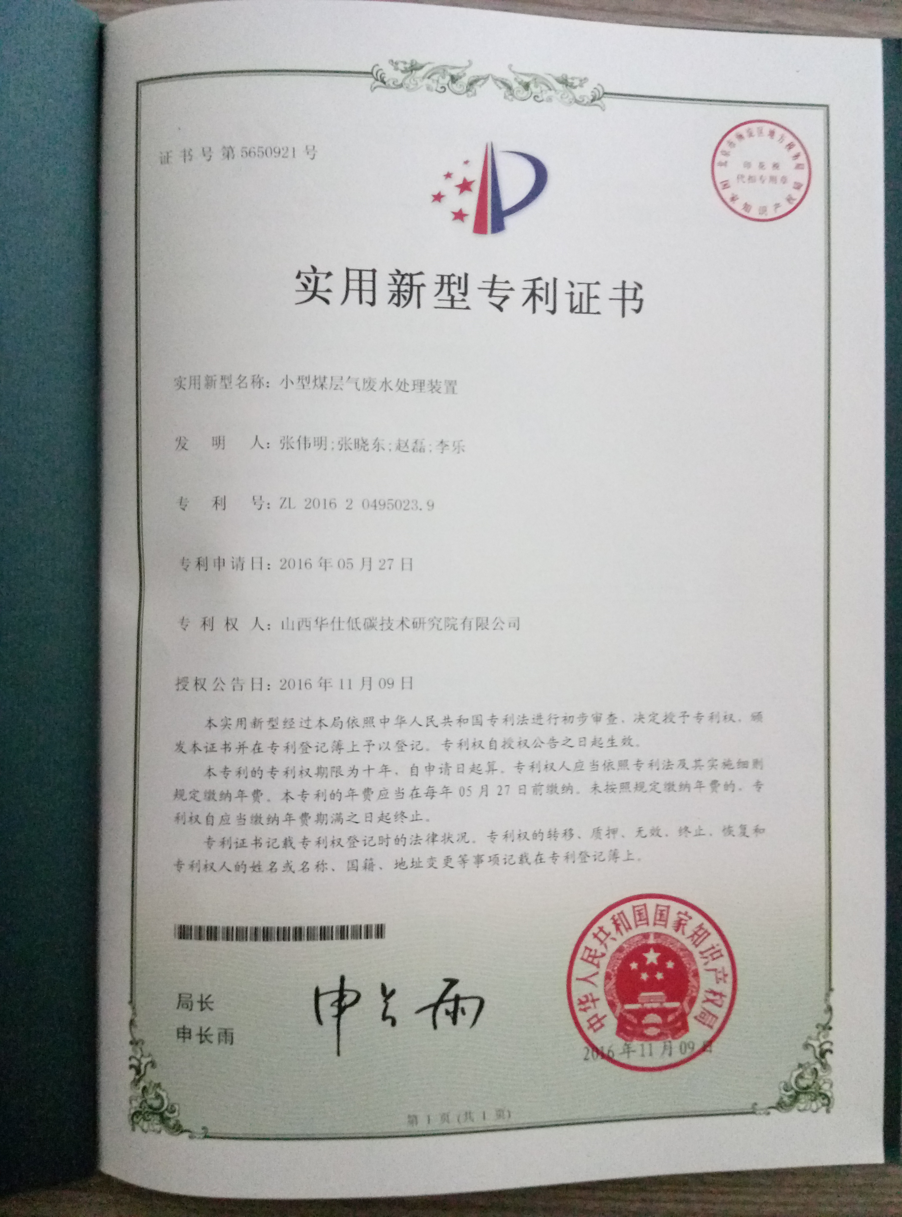 我公司提出的“自循环臭氧接触反应器”及“小型煤层气废水处理装置”实用新型专利分布于2016年10月及2016年11月获得国家知识产权局授权并颁发专利证书。